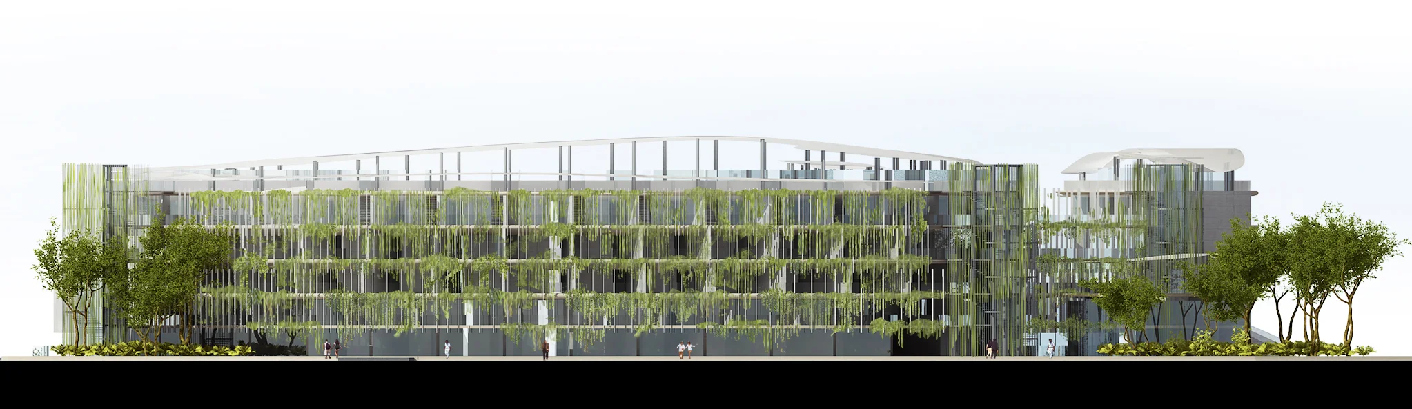 Meanwhile, the garden extends on the ground floor in cascading layers of swimming pools, bungalows with private access, a restaurant on the water and on the shore activities that link back the project section to the zero datum sea level. On the street side façade, and in a light clin d’œil to the iconic Holiday Beach nearby, the garden extends through the double skins of suspended vertical stone louvers that wave this time vertically.