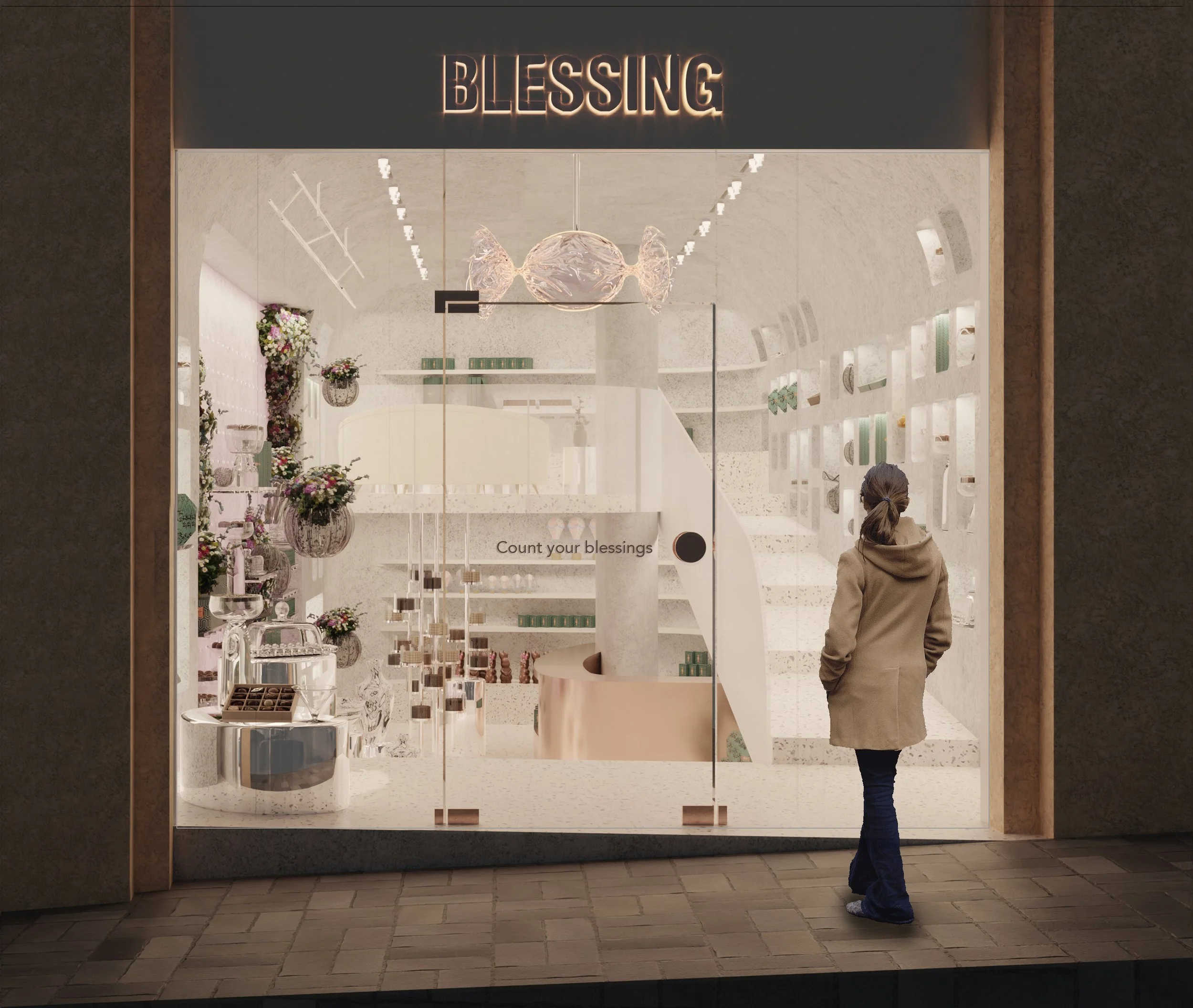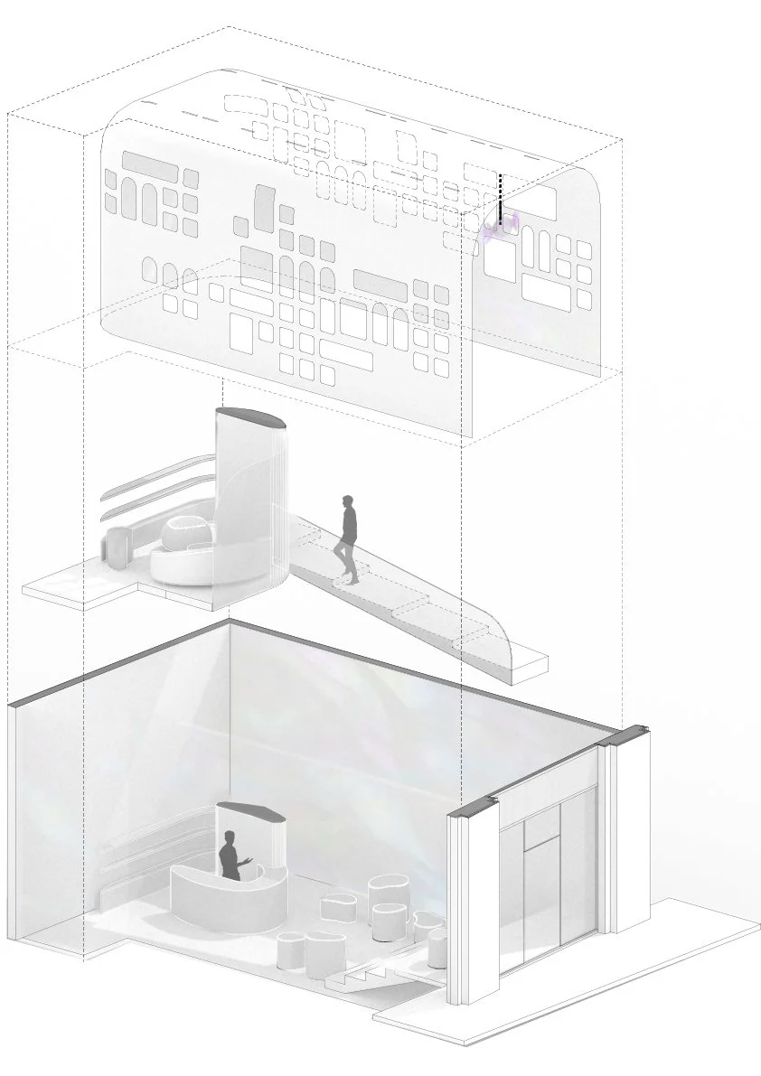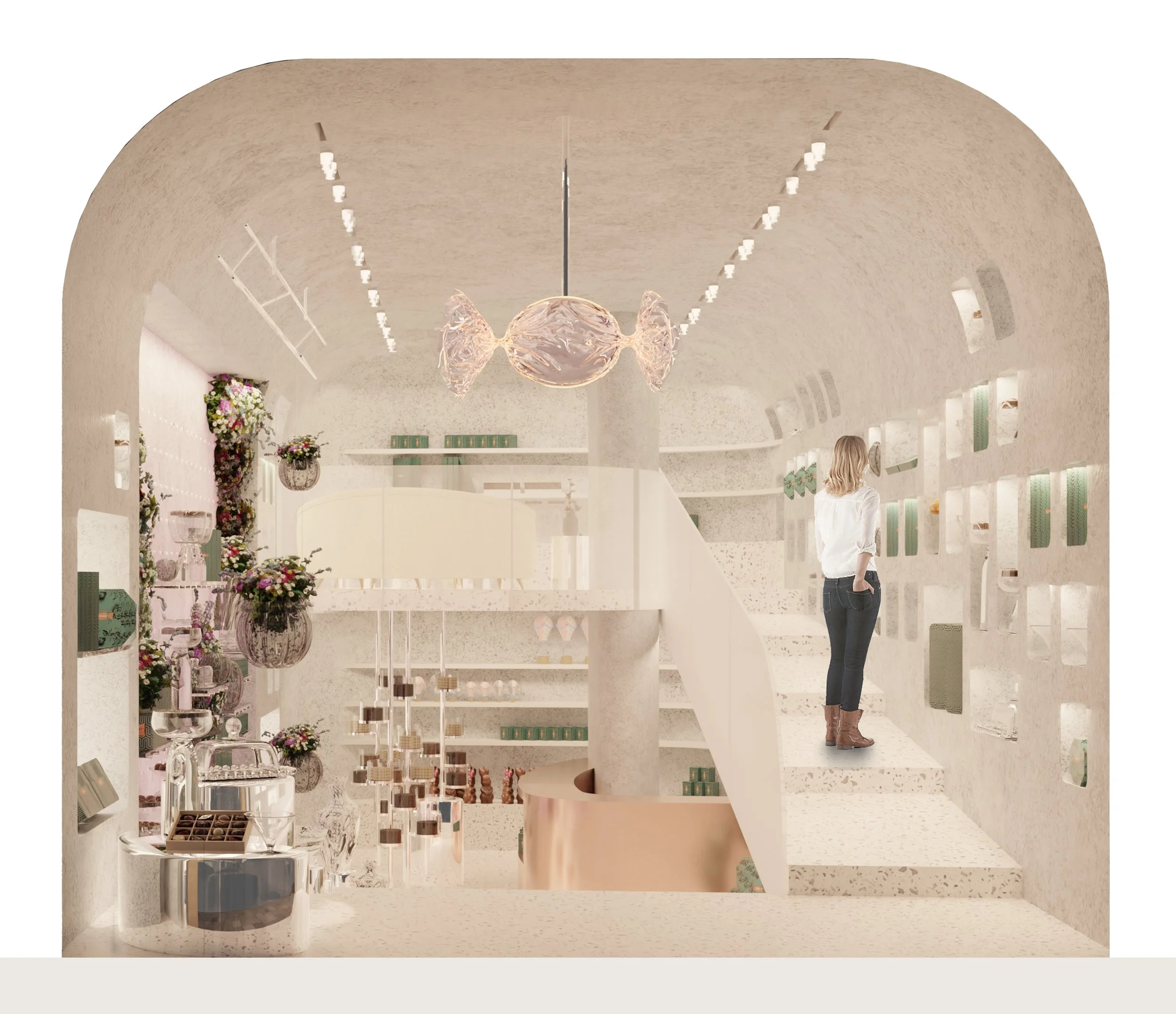 Like in a box of chocolate, to wrap the space with a soft curved lining and to split the levels above and below — the sidewalk. The surface is simply made of a creamy concrete, like a white chocolate, on the walls and on the ceiling. The floor is a bit more crispy, with broken stones for a cast on site terrazzo. On the walls, chocolate arrangements are laid out in various scales in niches, preset to the sizes, like in a museum.