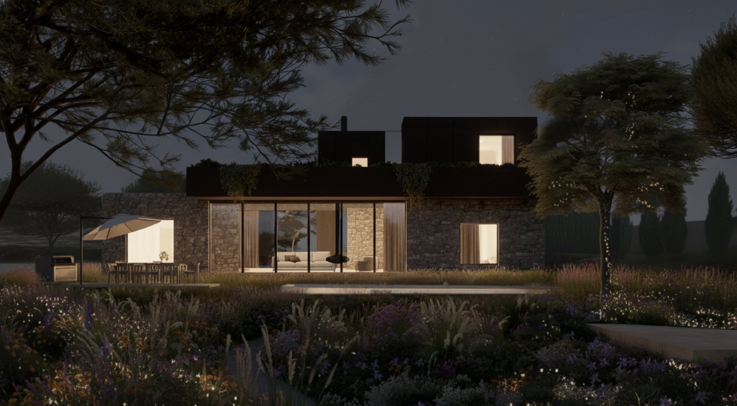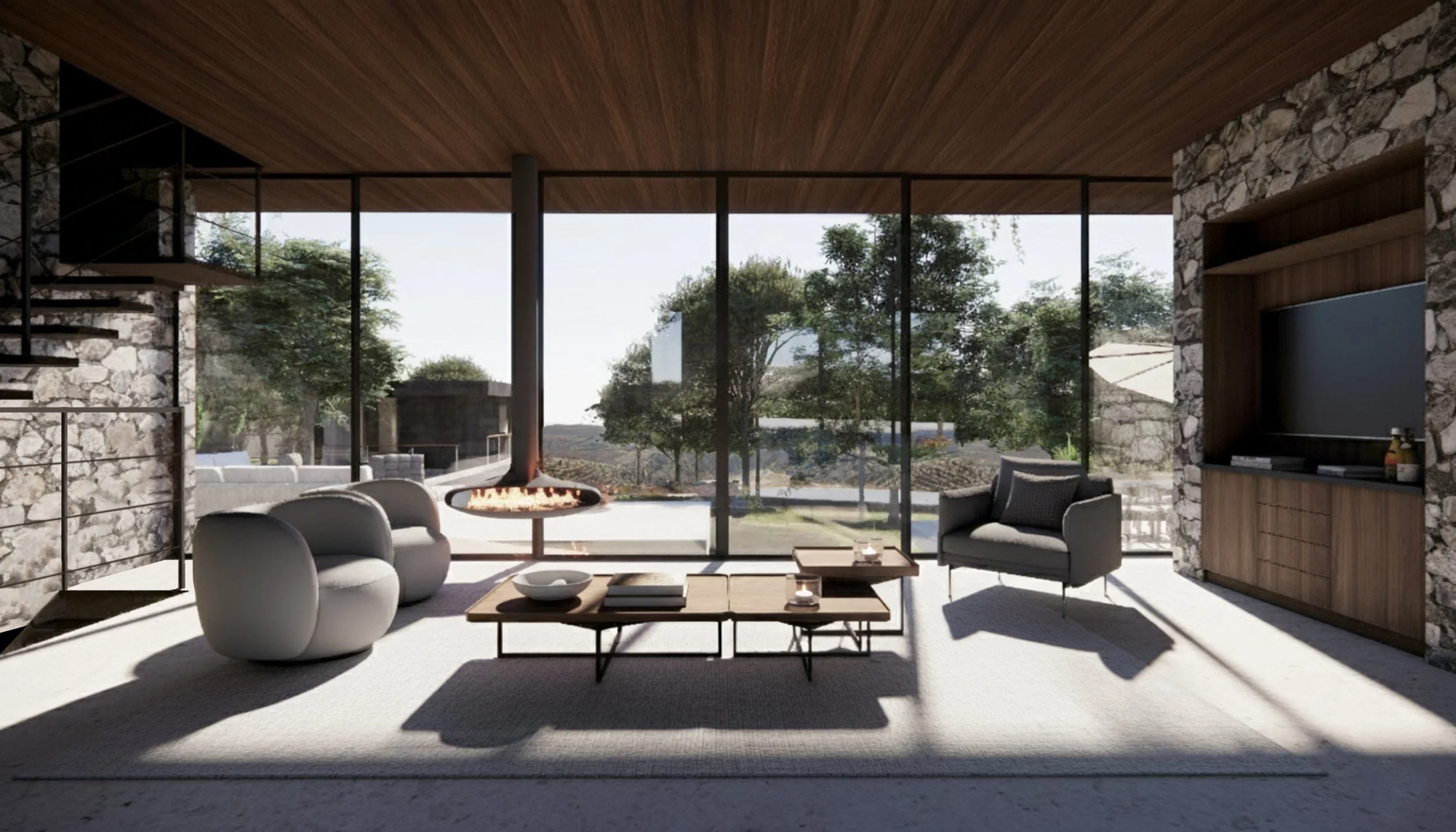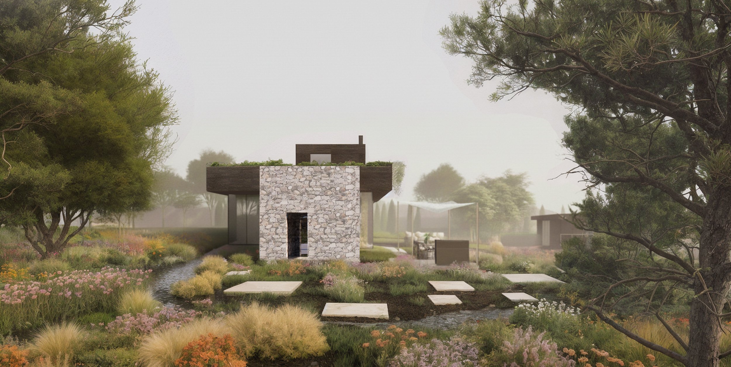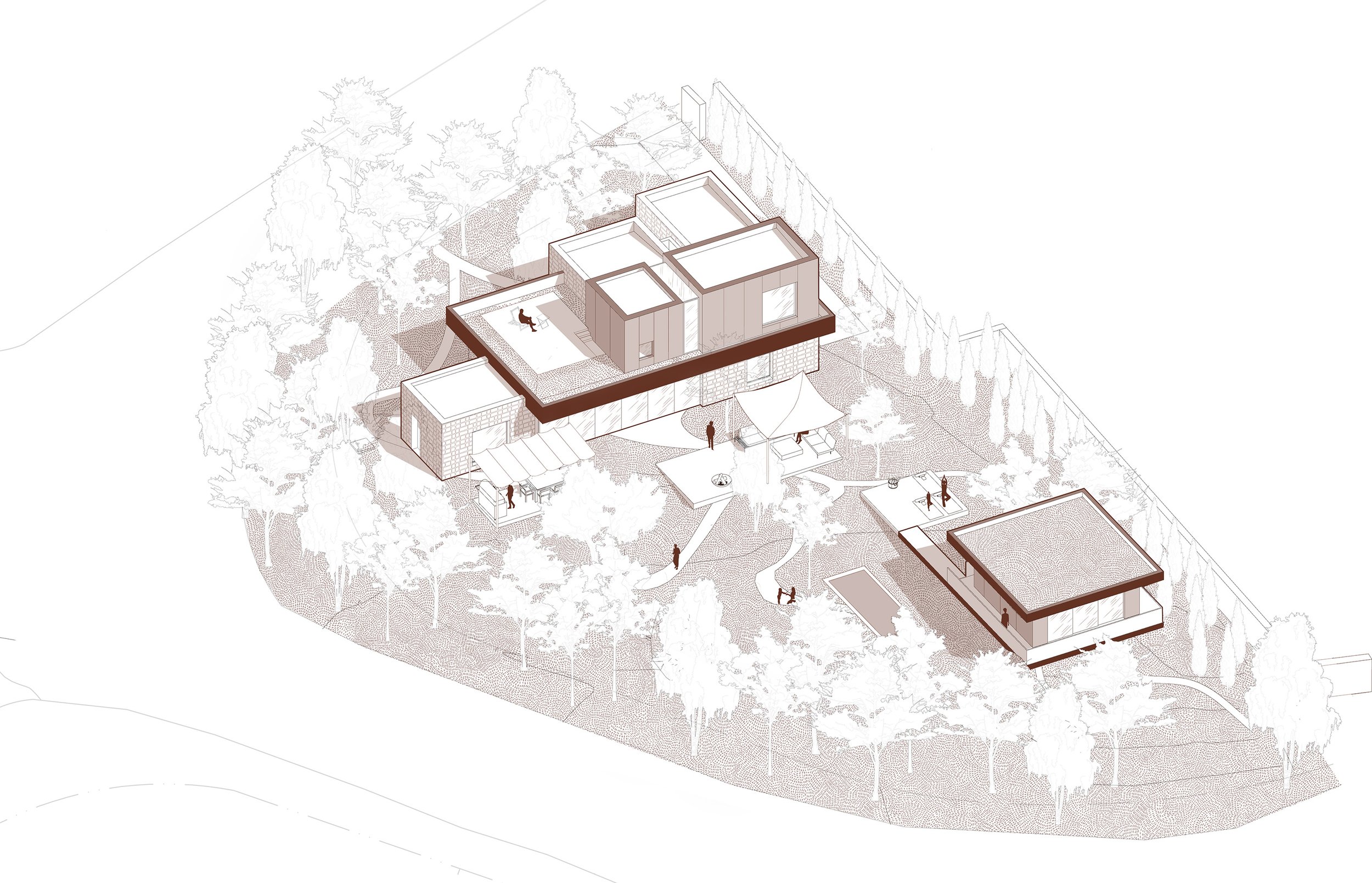 Named after a fragmented house in Japan, this house was born from Jossan and Zeina’s desire for a weekend retreat in Faqra. As their three boys grow, the house gradually adapts to their evolving independence. Four natural stone volumes sit beneath a rusted metal slab, while a fifth one, covered this time in metal, extends on the roof. Three ground-floor volumes house a bedroom each, while the western one contains a kitchen with its own independent entrance. The remaining sample, well lit and ample, glazed to the north and south, becomes the natural in-between — the entry and shared living area for gathering and dining.