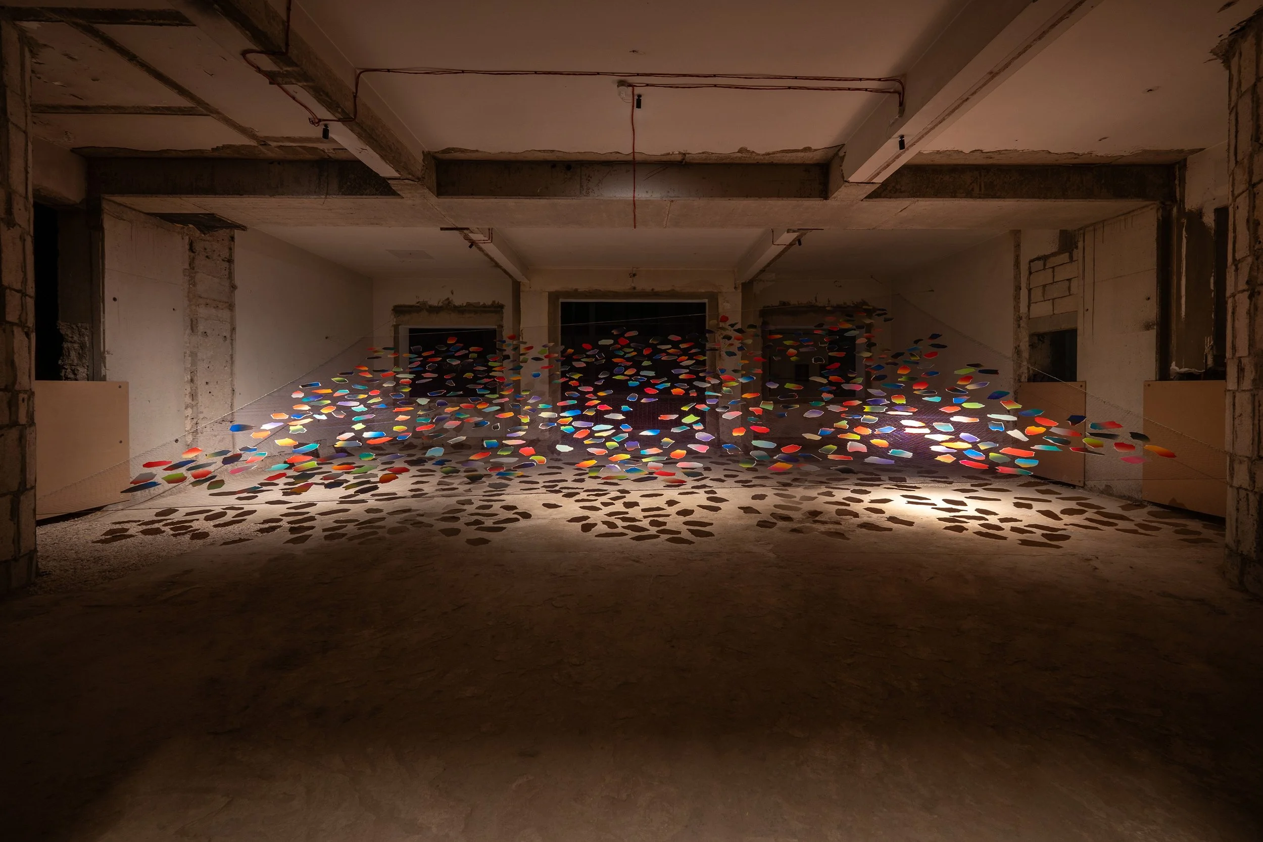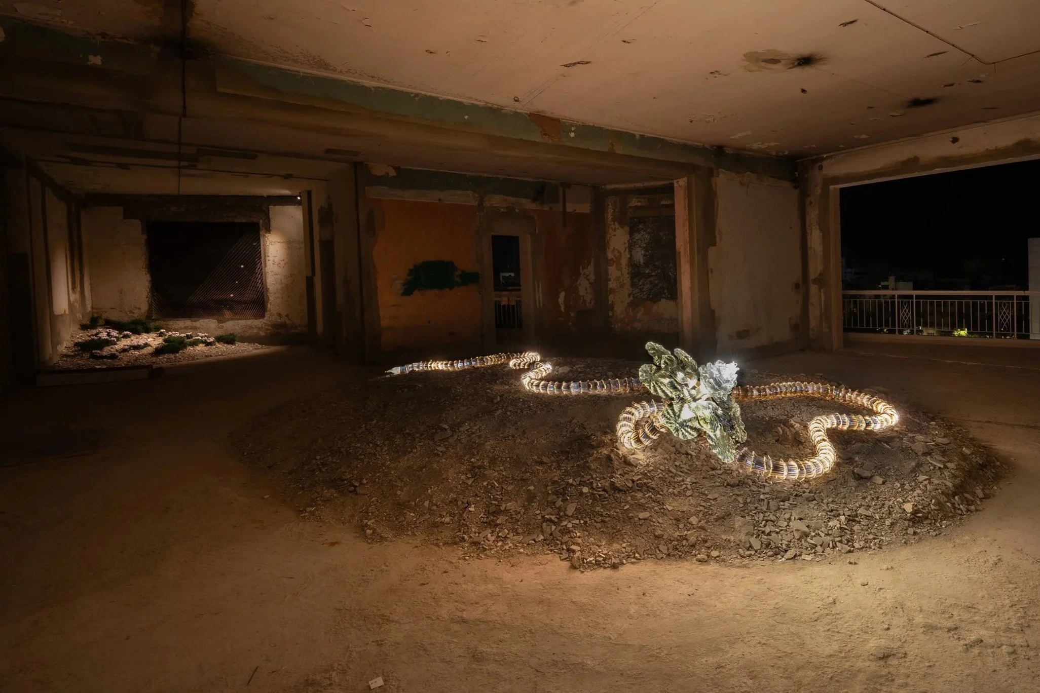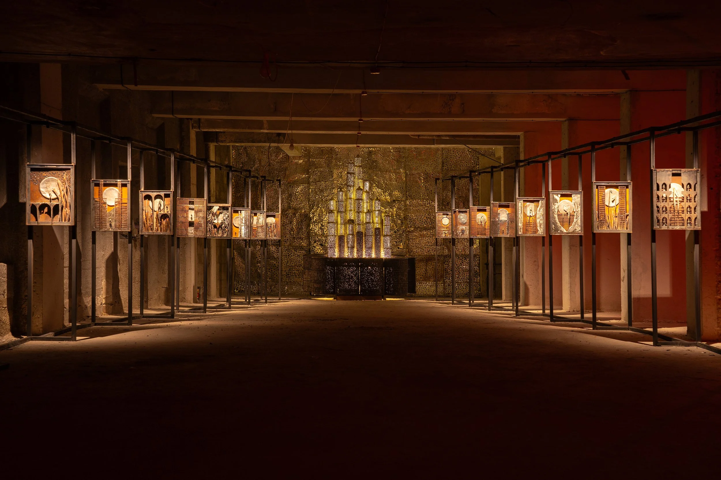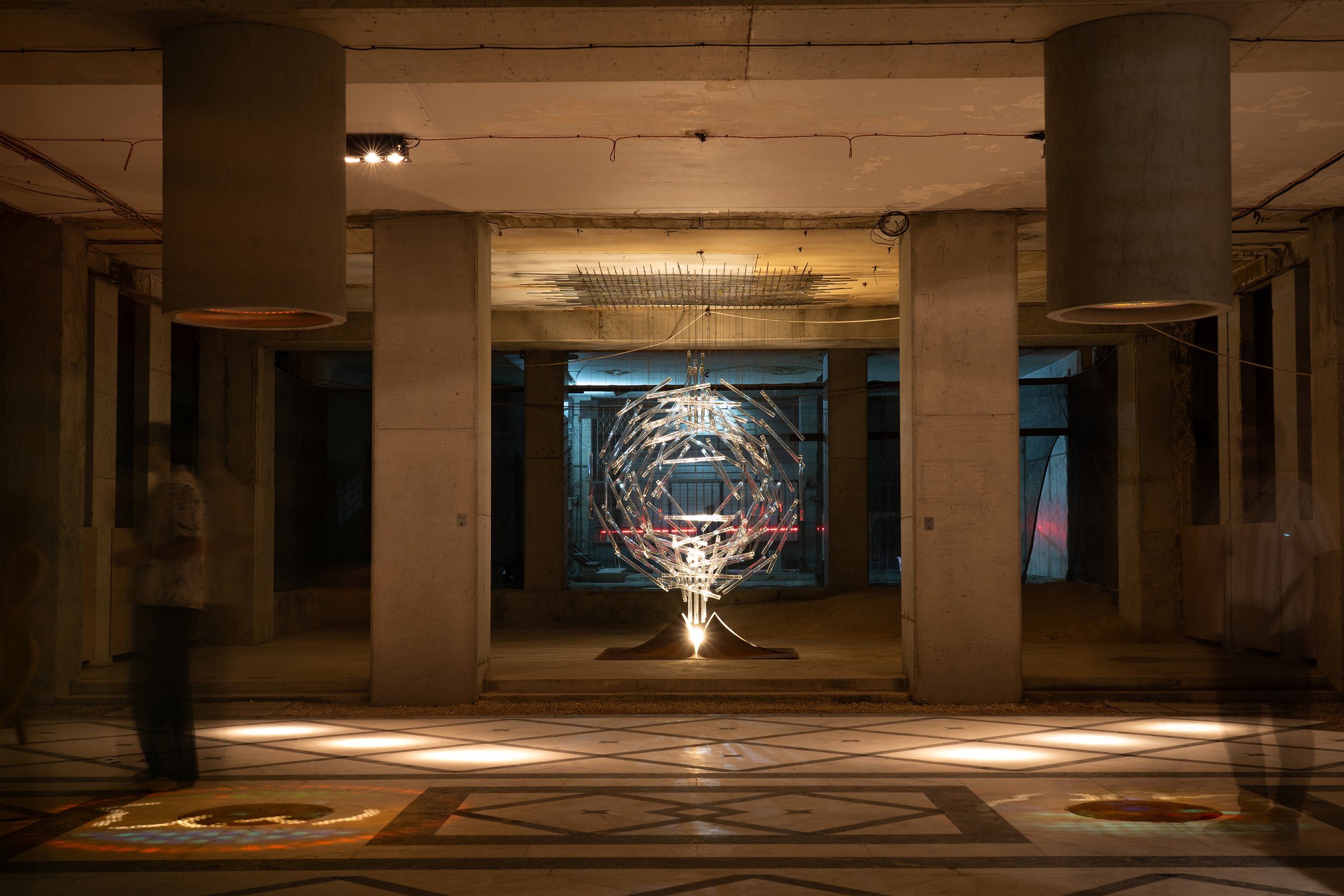 Moataz Nasr’s interventions at Immeuble de l’Union transform absence into presence. A three-meter perforated steel mala, crafted from reclaimed gas canisters, evokes resilience through its industrial form. Alongside it, backlit mosaics rise where columns once stood, projecting delicate shadows across the floor. Together, they merge memory and light, reimagining architectural voids with fragility and strength.