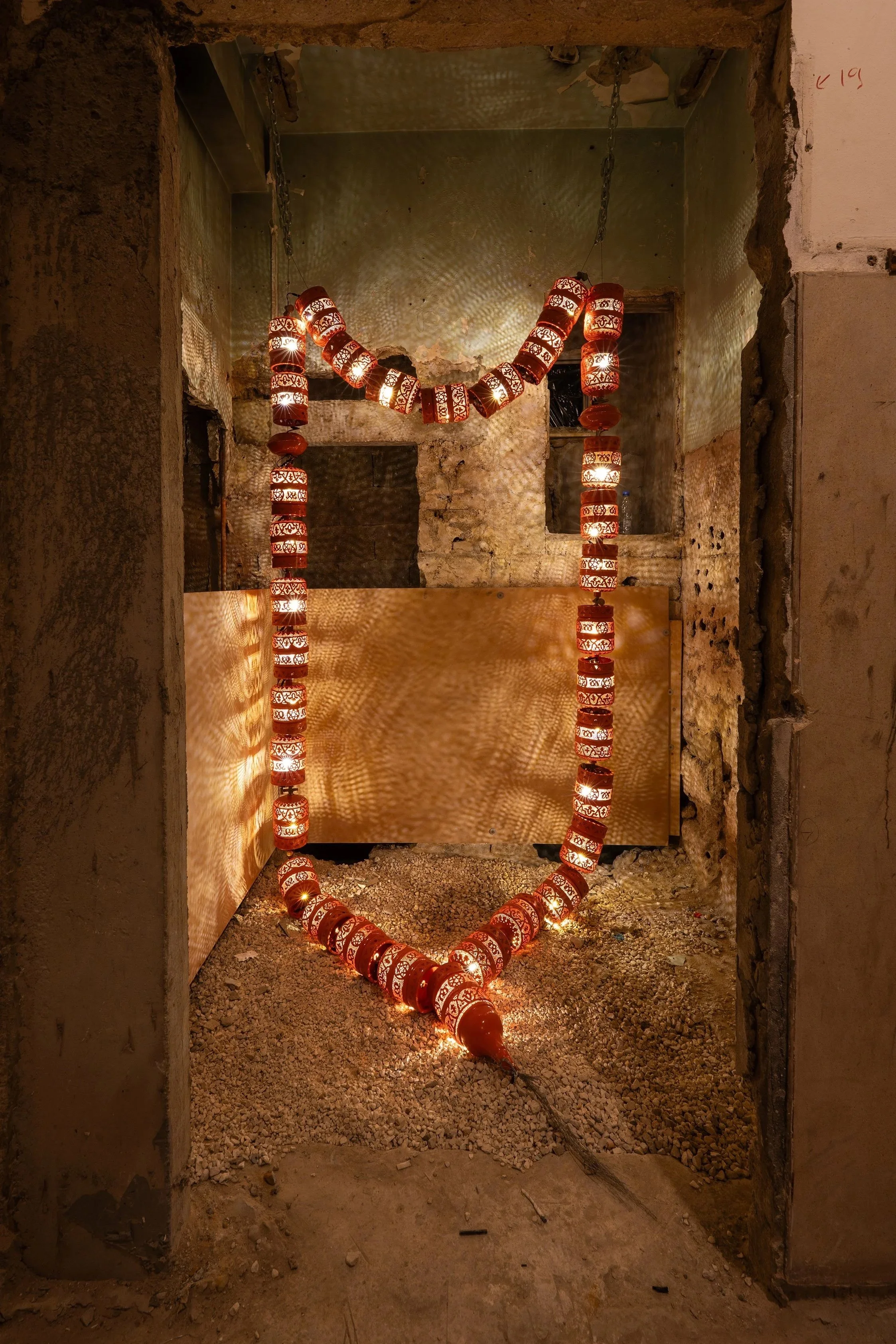 It is a pause thick with feeling. not through permanence, but through its very fragility, held delicately in the space between what was and what is becoming. The familiar becomes elusive, and yet more vivid. Memory, form, and feeling blur, and in that blurring, the ephemeral finds its strength. Moataz Nasr’s “Petro Beads” lives within this fragile threshold. Comprising a string of orange gas canisters, perforated with delicate patterns and lit from within, the installation mimics the form of prayer beads, casting luminous motifs onto walls and floors. The glowing surfaces speak not only of devotion, but of danger, fuel, and fire.