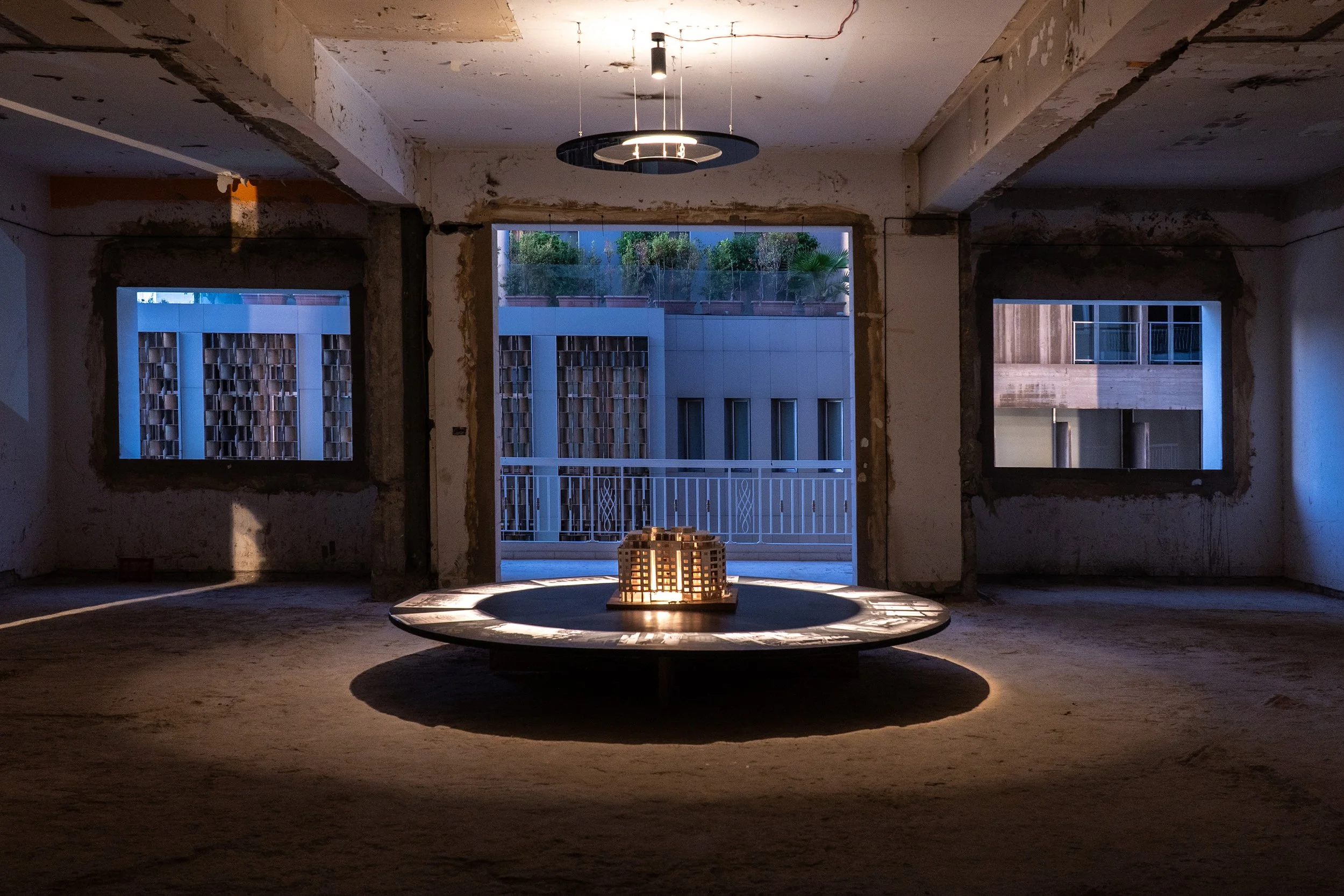 At the heart of the exhibition, the Union model stands upon a map of Beirut, anchoring the building within its wider urban fabric. Around it, photographs from the past and from the site under construction trace a continuum of memory and becoming. Suspended above, a solar eclipse encircles the volume—an artificial light technique that transforms the space into a moment of cosmic stillness. Shadow and radiance meet, mirroring the city’s own tensions between loss and renewal. The installation becomes both testimony and prophecy: Union at the center, Beirut unfolding all around it.